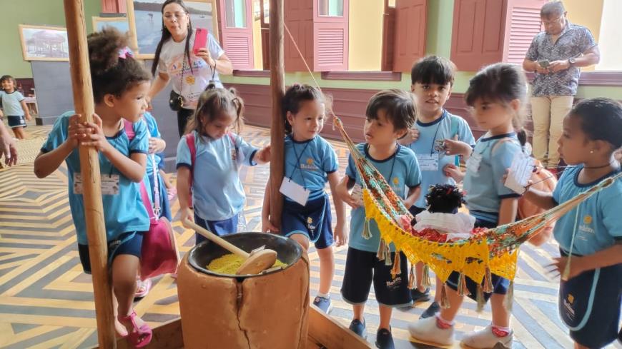 Estudantes da educação infantil visitam a exposição “Comida Cabocla”, no Palacete Pinho